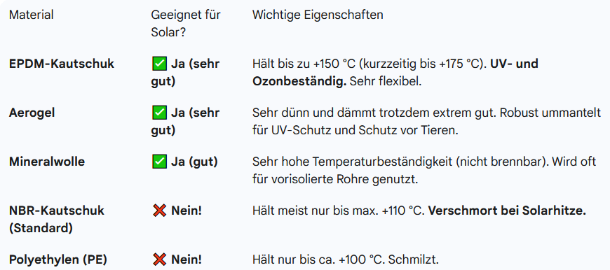 Spezielle Solar-Isolierung (z. B. EPDM-Kautschuk oder Aerogel) ist teurer als normale Dämmstoffe. -